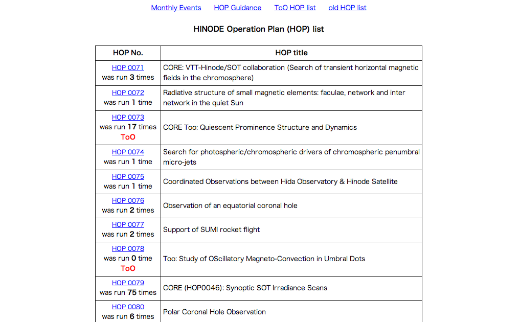 Hinode also runs long term synoptic HOPs at regular intervals, such as